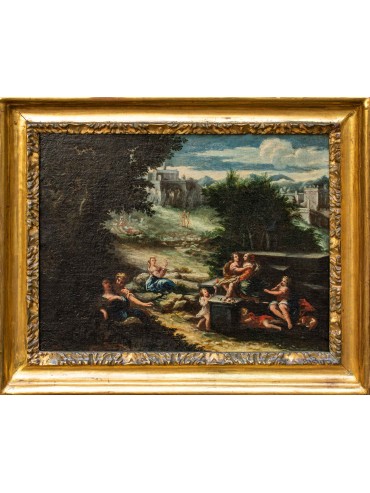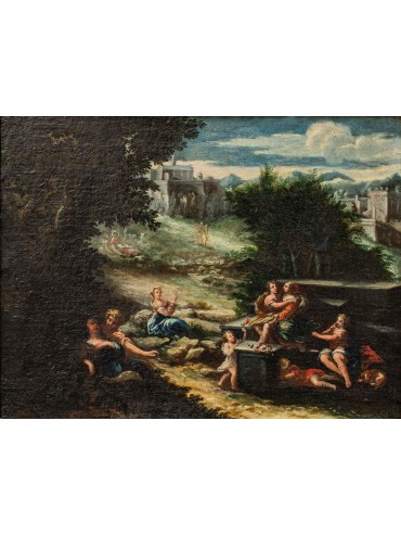 Rural landscape with gallant scenes Oil on canvas, cm 37 x 47.5  With frame, cm 61 x 50,5 17th century, Emilian school