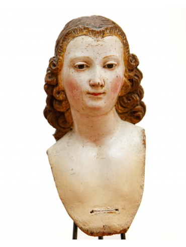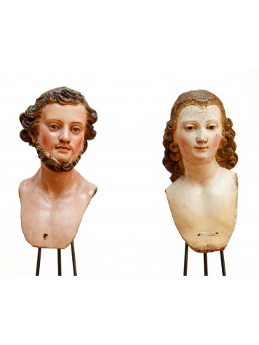 Two heads for Nativity figures Carved and painted wood with glass paste eyes, max height 14.5 cm Neapolitan Manufacture, 18th Century