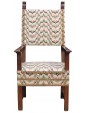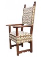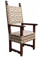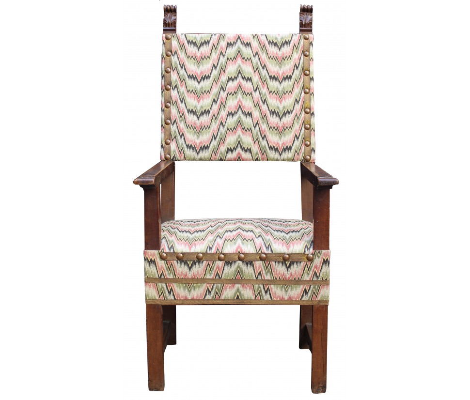The furniture in question is a throne of the seventeenth century, that is a monumental seat equipped with backrest and armrests, considered among the most important and relevant elements of the furniture. The posts are carved with a curly ending pattern. A polychrome fabric embroidered with flames and fixed to the structure by means of studded copper bands covers the seat and the back.