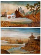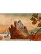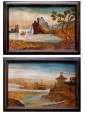 These two 18th century sculptures, made through a series of polychrome inlays of different woods, are very rare and meticulously executed. In fact, the artist here industrious, cabinetmaker and painter at the same time, applies on the table of fir a series of slabs and roots of different wood essences: you can recognize woods such as apple, pear, walnut, maple and cherry. The use of pyrography, that is to say the engraving by means of a tip of iron burned wood surface, allows to define the lines that characterize the different scores of the composition, Characterized by the drawing of colors played on different shades of brown and blue.