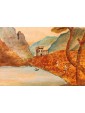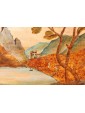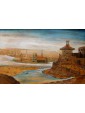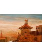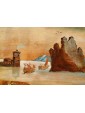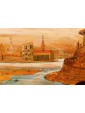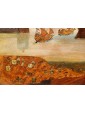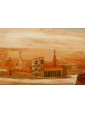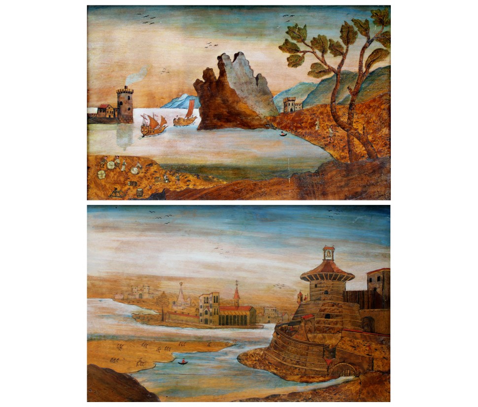 One of the two inlays depicts a scene of coastal landscape with busy figures in merchant activities: some follow the transport of goods on boats with sails deployed, while others are occupied on land, in the foreground. The silhouette of the tree on the right, the rocky spur in the center and the tower on the left, at the entrance to the inlet, help define the sense of depth of the landscape, concluded in the background by the blue contours of the mountains, Chromatically linked to the colours of the sea and sky, crossed by birds in flight. The figures, dynamic and synthetic in their movements and their somatic and costumistic characterizations, characterize both scenes, animating the setting: one more landscaping, the other more architectural. The second tarsia in fact presents numerous civil, religious and military buildings, analytically described in their different structural typologies. They, besides exemplifying the virtuosic prospective abilities of the artist here hard-working, provide an interesting testimony of the eighteenth century architecture: the buildings, porticoes, towers, lead back to that era of commercial contacts and military concerns, as can be seen from the sentry’s watch on the spiral path around the tower with the bell on top. The type of production, the figurative language and the use of the abbot in the background all refer to the environment of the centre-north of Italy in the second half of the eighteenth century, probably in an area in contact with the culture and tradition of Veneto.