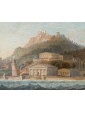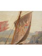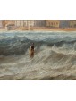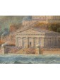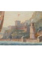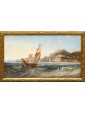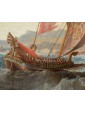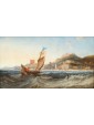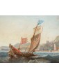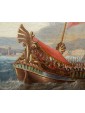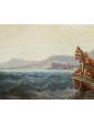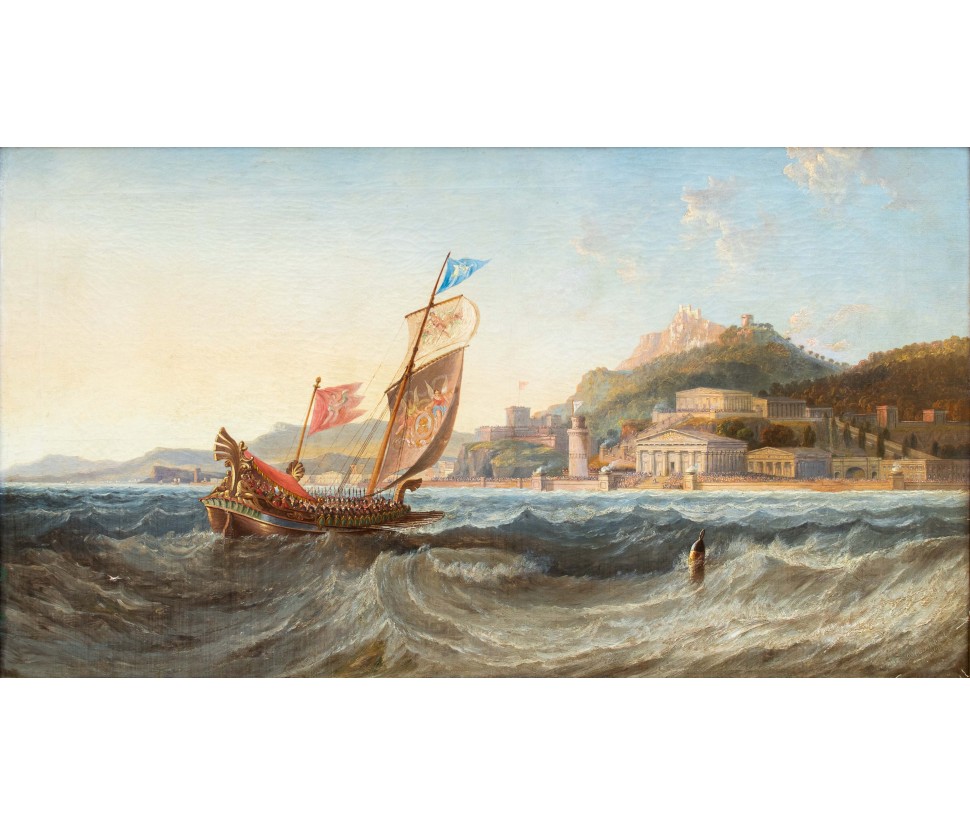 In this painting Carmichael depicts a typical warship of the ancient Greeks, the trireme, while sailing towards a port, at the foot of an acropolis full of temples and other monumental buildings. On land a crowd of people awaits the fighters, who return victorious from a war, with the braziers lit, smoking with incense, in thanks to the Olympic gods. The painter’s Greece is a land of dreams, just as the English of the first half of the nineteenth century imagined it, fascinated by ancient ruins and Mediterranean landscapes. A land that had recently risen from the secular setback imposed by the Ottoman Turks, also thanks to the efforts of brave English men, on all Lord Byron, for whom Greek independence meant the rebirth of the ancient classical civilization, with its ideal of beauty, that a few years later would have greatly fascinated painters of the Victorian era. In Carmichael’s painting, however, there is also the expression of that feeling of the sublime, which the romantic artists found precisely in the sea views, where water, currents and high waves leave the observer stunned, moved to reflect on the immense power of nature and to dream of an authentic and absolute freedom. The light of the early hours of the morning covers with a golden patina the waters, the wood of the boat and the dry land, where pink reflections charge with a charm out of time temples, towers and other buildings neatly arranged on the slope. Carmichael is an excellent painter of the English nineteenth century, able through his marine views, to communicate the ideals and feelings of the man of romanticism.
