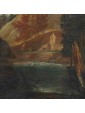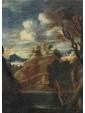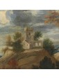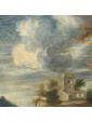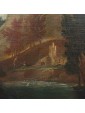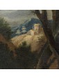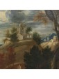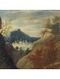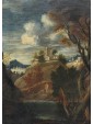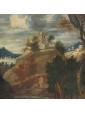 The painting under consideration here represents a great glimpse of an agreste view referring to the years following the second half of the seventeenth century and in particular to the Veneto area.The central part of the composition is dominated by a hill with a tower surrounded by shrubs of various heights, probably the home of a gentleman who owns the neighbouring land. Going down the hill, we can see a short stretch of dirt road, at the end of which we see a couple of characters one on the ground and the other standing, flanked by a small brick building. The two are on the banks of a small river, which the artist also describes the ripples through slight and thin luminities, that runs through the landscape and occupies the lower part of the painting, in which dominates the thick cube forest. In the foreground, on the right, a long tree trunk whose sections twist together until the height of the fronds. This element allows the painter to create a continuity with the background of the sky and the rest of the scenery: always on the right, next to the central massif, there is another high rise with a tower and a small house from which the smoke of the lit fireplace comes out, That, thanks to the contrast with the mountain of bluish tones with more force, without getting lost in the horizon. The same solution is adopted for the left side of the canvas, where a village on the plain rendered in very clear tones stands out strongly from the great mountain that overlooks it. In the vast sky dominated by a cloud pile that is passing exactly above the central massif, the tones of color already used by the artist for the other elements of the composition are taken up, which allows to harmonize with wisdom the whole view.