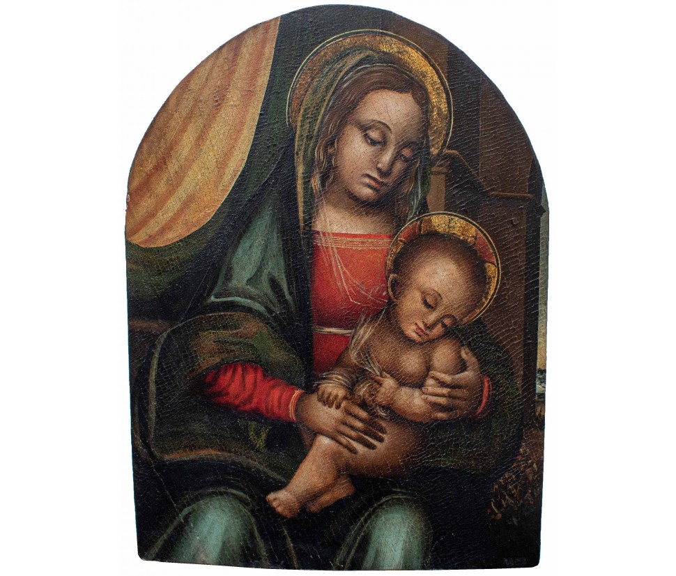 A fitting stylistic comparison is highlighted with the canvas depicting a Madonna and Child by Bevilacqua, now kept in the Sforzesco Castle Art Gallery, and with a Madonna del Latte, in private collection in Milan. The painting under examination also seems to look at some performances of the Bergognone: in the richness of colour and the intimate maternal scene of the Madonna with Child preserved at the Pinacoteca di Brera and in the delicate and wise use of the gold of the Madonna with Child from the Royal Museums of Turin, without forgetting the Marian compositions by Vincenzo Foppa.