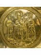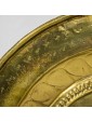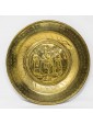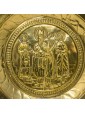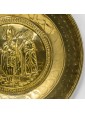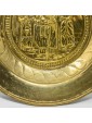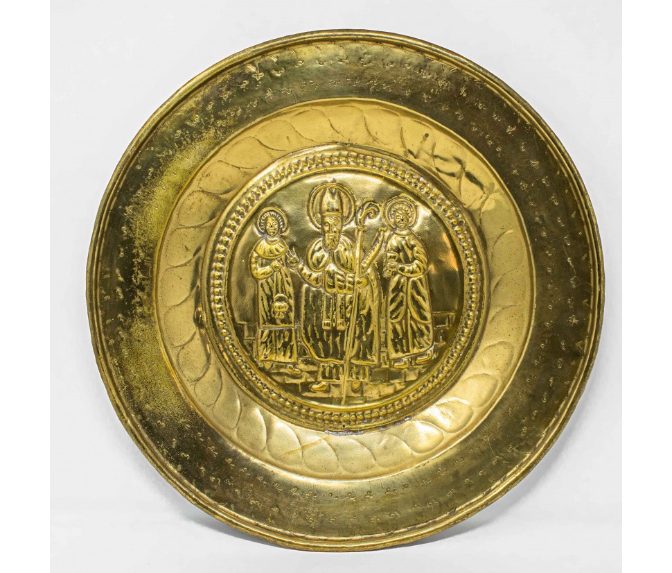 The alms plate, properly called "alms plate", is a container usually decorated in the form of a large bacille or plate for the collection of offerings for the Church; generally made of metal such as bronze, brass, silver and gold. Constant is the presence of central decorations fitomorph or girandola or with subjects taken from the bible, can also present in the center a support to fix an iconographic element (a statuette) or even a candle holder or compartments for the subdivision of alms. The almen’s plate is an artisan object present and documented in all southern Europe since the Middle Ages, from the second half of the 15th century until the mid 18th century and beyond; of initial Flemish production (area of Mechelen/Malines) and German (area of Nuremberg) and as regional production expands. It is so called because in the churches of Germany of the early fifteenth century (about 60 years before Martin Luther) during the masses it was used to collect the offerings in plates, cubs and bowls of brass, said precisely for this alms. Once only the sacristan handled them, passing among the faithful during religious services in the church and were used for that purpose until the late nineteenth century; then replaced by almoner cloth with slit opening, most likely for confidentiality. The craft shops of Nuremberg began to build in quantity and with more and more valuable specimens, especially after, from the middle of the fifteenth century, spread among private individuals the fashion of hanging various types and manufacture at home. These dishes are often presented in a series of standardized performances due to a massive production of proto-industrial type spread especially in the areas of Catholic influence (southern Germany, France, Italy, Spain and Flanders). In Italy the almsplate is also used on Good Friday to support the nails and the crown of thorns during the ceremony of the deposition of Christ from the cross while in Sardinia it is made a particular use, becomes a musical instrument used to accompany the Sardinian dance.The alms plate examined, in brass, presents three figures including a saint bishop and two attendants with a chalice and the turibolo for incense. This dish is part of the tradition of plates decorated with sacred depictions, both Old Testament episodes and new testaments, such as Saint George on horseback, but also the Agnus dei, Adam and Eve etc.