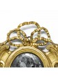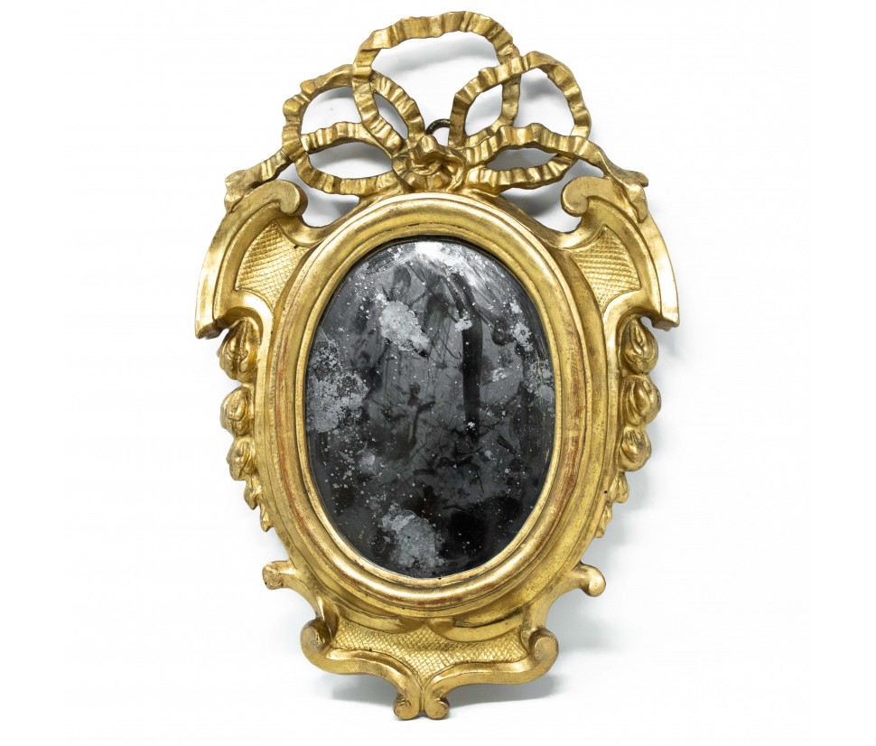 Compared to the Louis XV style that developed during the last decades of the eighteenth century, called Louis XVI (although it spreads before the ascent to the royal throne of King Louis XVI) prefers the classic and elegant lines, almost in antithesis with the abundance of decorative elements typical of Rococo and Louis XV. Louis XVI acceded to the throne in 1774, on the death of his grandfather, the long-lived king Louis XV. Unlike his predecessor, a great patron and lover of the arts, the young sovereign preferred solitary and often bizarre pastimes, such as building watches or locks. The Louis XVI style thus developed independently of the king’s will, and was the result of multiple factors. It must be said that the success of this style is largely due to Queen Marie Antoinette, who invested a lot in the renovation of furniture and decorations but also thanks to the support of Madame de Pompadur and Madame du BarryWe can say that the Louis XVI is a style of passage, from rococo to neoclassicism, more simple and sober but always of refined execution. The key element is the renewed interest in the themes of classical Greek and Roman culture, which prefers linear forms, geometric composure, symmetrical decorations and evocative of antiquity. Garlands, laurel leaves, Greeks, floral motifs, mythological inlays, columns and capitals, which combine with precious materials such as wood essences, gilded bronze and marble, in a formal synthesis that reflects the taste of the time. In Italy, the Louis XVI style adopts the stiffened and geometric structure without giving up the memory of the rocaille taste in decoration, as witnessed by the present mirror from the frame to the time stresso elaborate but with simplicity. The cross-ribbons of the top cyma are a typical element of the period while the side and bottom volutes still denote the interest in the style of the previous period.