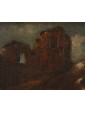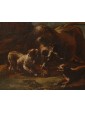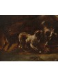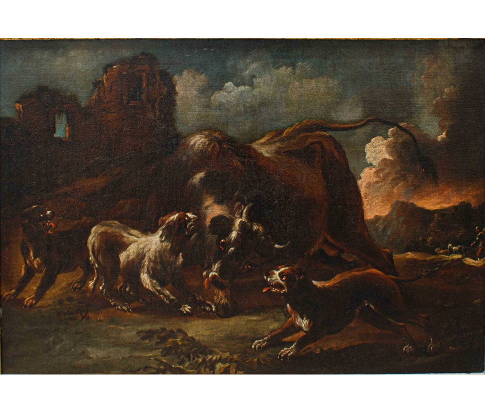 The canvas in question depicts a fight between dogs and a bull in which they fully manifest the expressive power and strength that the painting of Crivellino can achieve. The three dogs, caught in different poses, growling, with their mouths open seem to surround the bull in difficulty. The brushstroke is fast, yet defined, and vibrates, conveying further excitement to the dynamism inherent in the scene. The rendering of the mantles, of great quality, seems alive, rendering the real idea of the hair of the animals. The bull, in difficulty, seems to rotate its head ready to collapse on the ground. The size of the animals in struggle, dominate the surrounding landscape, focusing attention on combat, however fascinating the architectural ruins and the fade in the distance of the sky. A figure of shepherd walking while observing the scene from a certain distance further enriches the composition.