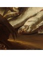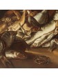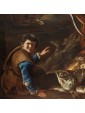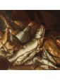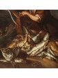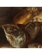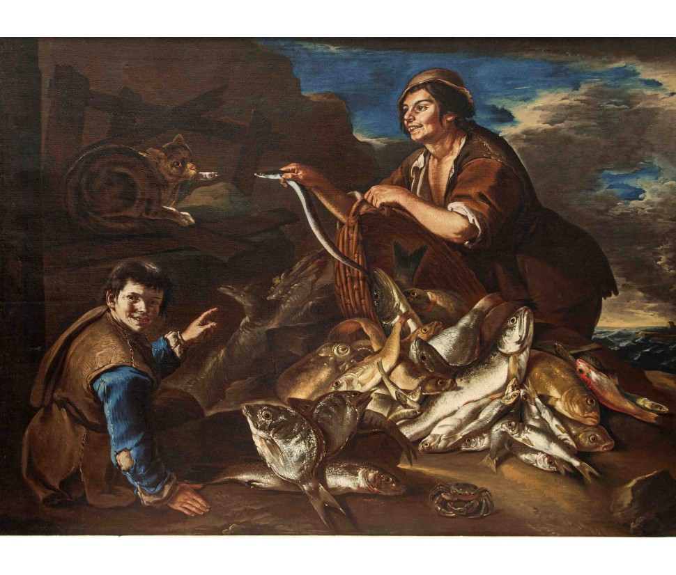 Many within the corpus of works of Todeschini are therefore representations similar to the one presented there, which collect both scenes of daily life involving different characters and sometimes even animals and essays of still life of fish, game or fruit and vegetables described with lucid naturalism. See in this regard the bewilderment of the fish in the painting in question, described in detail and well rendered especially in the brightness of the scales. Paintings by Todeschini similar to the one under consideration are found in Sellers of fish at the Palace Museum in Wilanów; Market scene in the Private Collection shows the ability of Todeschini in choral representations even full-length but it is the gesture to overturn the fish from the basket to remember the painting under examination. But it is in portaolo and still life of fishes that one can observe how Todeschini inserts in his works quotes from his other paintings. In fact, in the canvas of the private collection we observe a figure of a young man who looks at the viewer and points at the carrier and fishmonger in the center of the composition. Also an animal appears here, this time not a cat but a dog, but above all it is the context to resemble: in fact, to the right of both the canvas under consideration and in Portarolo and still life of fish opens a glimpse of the rippling sea of waves covered by a thick sky of clouds.