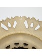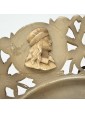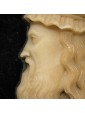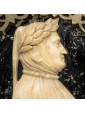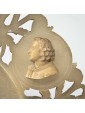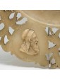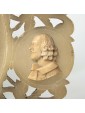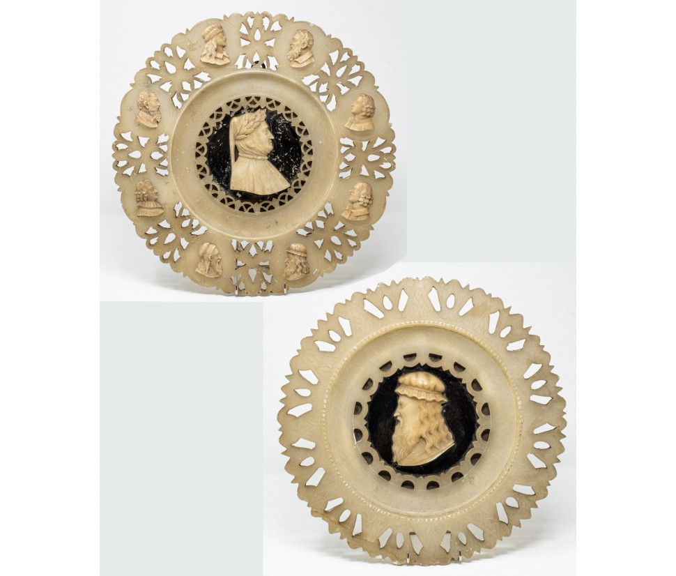 The pair of alabaster discs features a central cameo with the effigy of Petrarch and Leonardo, probably part of a larger series that had as protagonists illustrious characters in Italian history. On the openwork frame of Petrarch there are portraits of some characters that face each other, combined for centuries, as can be seen from the style of the garments that go through several centuries: from the thirteenth century, in which men wear long-pointed headphones, to the fifteenth and sixteenth centuries, the two characters at the top, the seventeenth century, with the large collars, up to the eighteenth century.