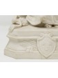 The sculpture rests on a rectangular base with rounded corners. At the center a shield flanked by walnut leaves on the left and bay leaves on the right.