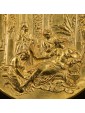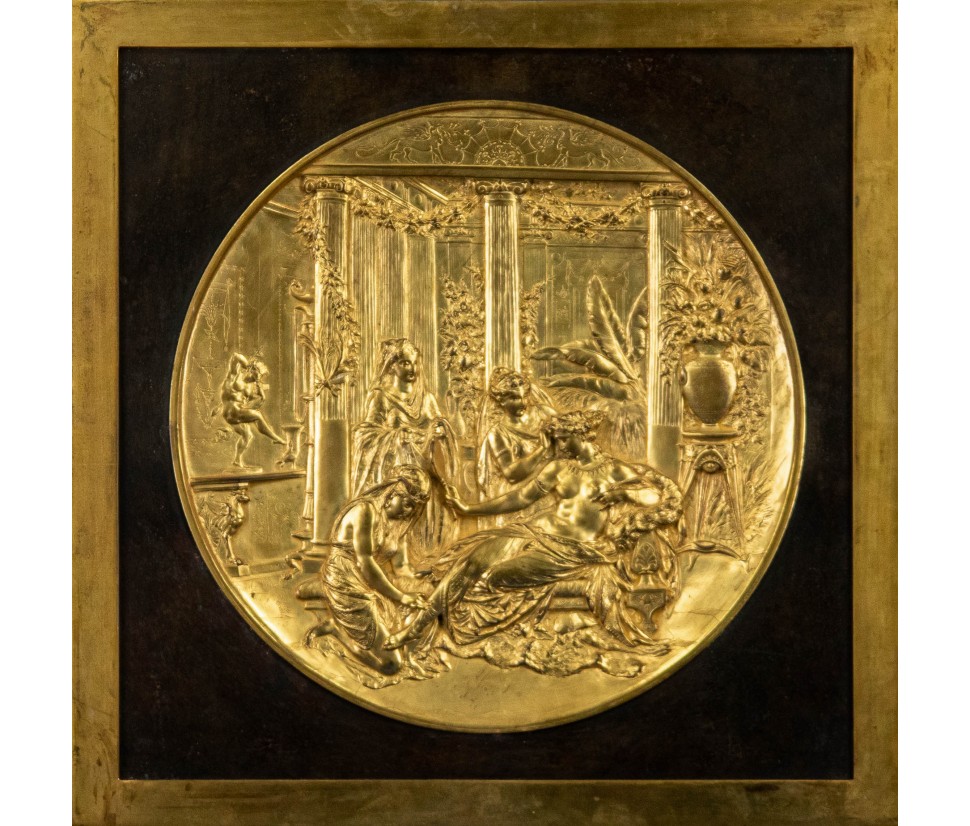 The present round in chiseled copper is to be referred to the fine manufacture of George Richards Elkington (17 October 1801 - 22 September 1865), producer of Birmingham and inventor of the first process of commercial electroplating, whose patent bears the name. The round depicting Pompeian Girls is the work of Léonard Morel-Ladeuil (Clermont Ferrand, 1820 - Paris, 1888), goldsmith and French sculptor, among the most important "designers" of the English company. He gained the appreciation of Napoleon III through several commissions, causing the envy of contemporaries, annoyed that a craftsman obtained commissions directly from the king, going so far as to boycott the young artist and the vase Dance of the Will, preventing its sale. Encouraged by the foreign merchant in Paris, Marché, to continue, concentrated mainly on the production of religious statuettes, until 1859, when the Elkingtons, in view of the Great Exhibition of 1862, they offered him a job at their factory in Birmingham. Morel-Ladeuil worked for the manufacture for twenty-three years; the first result was one of his most famous masterpieces, the Shield dedicated to the Lost Paradise of Milton (in repoussé steel and silver), a flagship work at the Paris Exposition of 1867. The shield was purchased by the British government for £3,000; the success of this work is demonstrated by the worldwide spread of copies produced using the innovative electroplating technique. The round in question, in its primary model, was made of silver as the main work of Elkington&Co’s stand for the Philadelphia exhibition in 1876, with the technique known as repoussé or repoussage. This method consists in the processing of malleable metals ornamented and shaped by hammering from the back to create a profile in bas-relief. Following the event, the producer received numerous commissions of the same, then exhibited at the Paris Exposition of 1878, bringing on the back the words of the manufacture and copywright translated into four languages. A copy of the round is kept at the Victoria&Albert Museum in London.