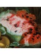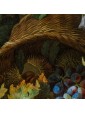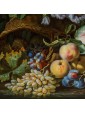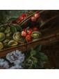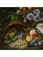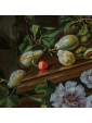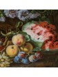 It should also be noted that the various fruits depicted do not belong to the same seasonality, which suggests that the artist has made some of them without a model from life, but painting them by heart, obtaining a general effect of great naturalism. Worthy of note is also the ability of the Czech artist in terms of color combinations: the red accents of cherries and watermelon are enhanced by the complementary green predominant in the leaves and pears. To the violet of the flowers and plums responds the yellow of peaches and grapes. These combinations expand the effect of three-dimensionality already given by the chiaroscuro contrasts that wisely balance the most striking colors.