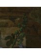 The various types of fruits are arranged in overlapping groups that wrap themselves around each other following diagonal trends. From below we see a bunch of white grapes together with peaches, plums and half watermelon. In a slightly more backward position is an inverted wicker basket in which there are some chestnuts still in their curl and partially covered by large green leaves mottled with orange. Flowers with lilac petals, the same that wrap around the base of the column in the background, cut the canvas in two parts. A wooden plane drops diagonally above them from which some pears fall while cherries fall from an inverted backsplash.