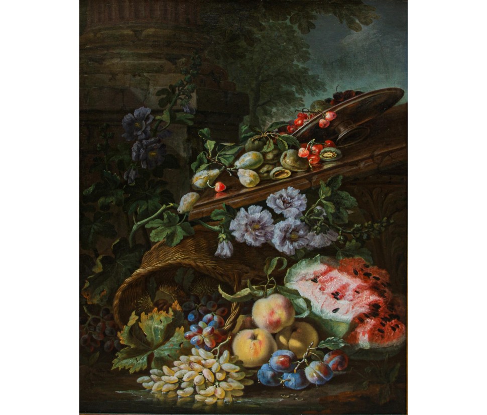 As in the compositions of Tamm or Vogelaer, the background to the flowers and fruits is an architectural fragment, already introducing that taste towards the ancient ruins that will be fully consolidated in the eighteenth century.