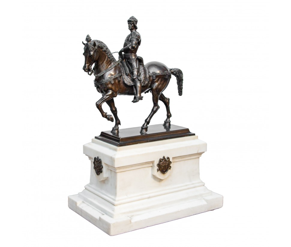 The work under examination is a reproduction of the famous equestrian monument executed by Andrea del Verrocchio for the Campo San Zanipolo in Venice between 1480 and 1488. It depicts the condottiero Bartolomeo Colleoni (1395/1400-1475), one of the most enterprising captains of fortune of the Republic of Venice of the fifteenth century, nicknamed by his mercenary soldiers "invincible", impersonating the classic bold and bold leader, full of charm and pride. The theme of the equestrian statue is particularly widespread in Western sculpture since Greek art. From the Roman Empire this subject assumed a heroic but also propagandistic function that characterized it until the twentieth century. More or less famous condottieri were portrayed in this capacity; famous are the examples of Marcus Aurelius, Napoleon and Garibaldi, there are many works of this kind that adorn the main Italian and foreign squares.