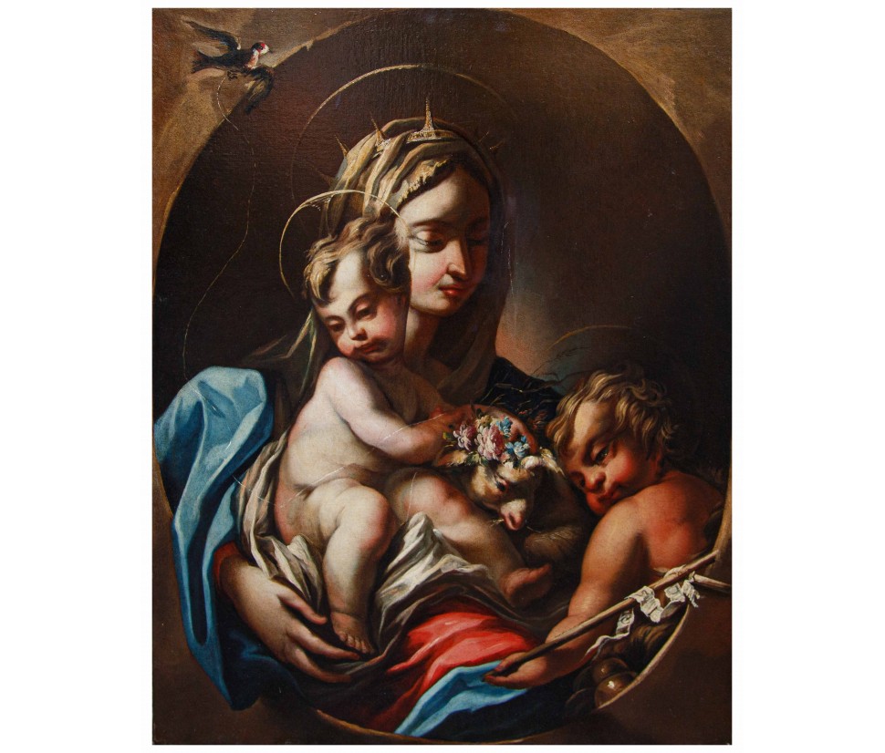 In this painting the Madonna, supporting the Child and in the company of the Infant Baptist, stops within an oval, escaping illusionistically through a soft fold of the mantle. The group portrayed is on fire symbolically and concretely: the ardor of divine love shines through the turned bodies and the reddish joints of the retracted, elongated eyes like strands of hair trembling in the air and the color of the grain. Light also glides over the silky robes of the Virgin, reflecting with dazzling light. Delicate as a hair, the cord that holds the Child holds the happy smoothing of the wings of the goldfinch, symbol of the future Passion of Christ: medieval tradition wanted a goldfinch, in an attempt to extract the thorns from the crown of Jesus' thistle, was stained with His blood. Even the sweet lamb surrounded by a wreath of flowers, tenderly intent on chewing one, is a living Christian symbol of sacrifice and Resurrection.
