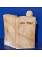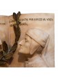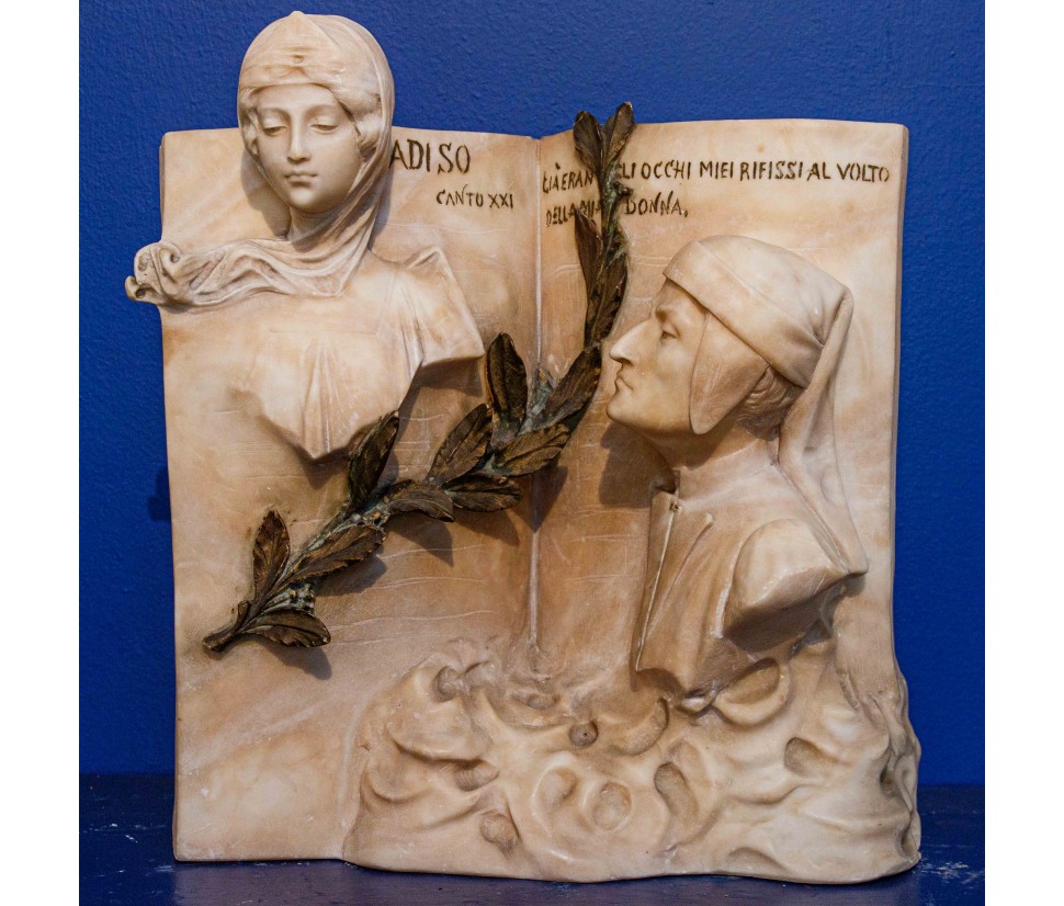 The present relief in alabaster, of which the great technical expertise is evident, imitates the pages of a book, Sulle due facciate di questo figura in aggetto il busto di Dante Alighieri, nella tipica posa di profilo alla maniera antica, which observes enthralled the beloved Beatrice carved in the next page and in an elevated position, to emphasize her belonging more to the spiritual world than to the earthly one.