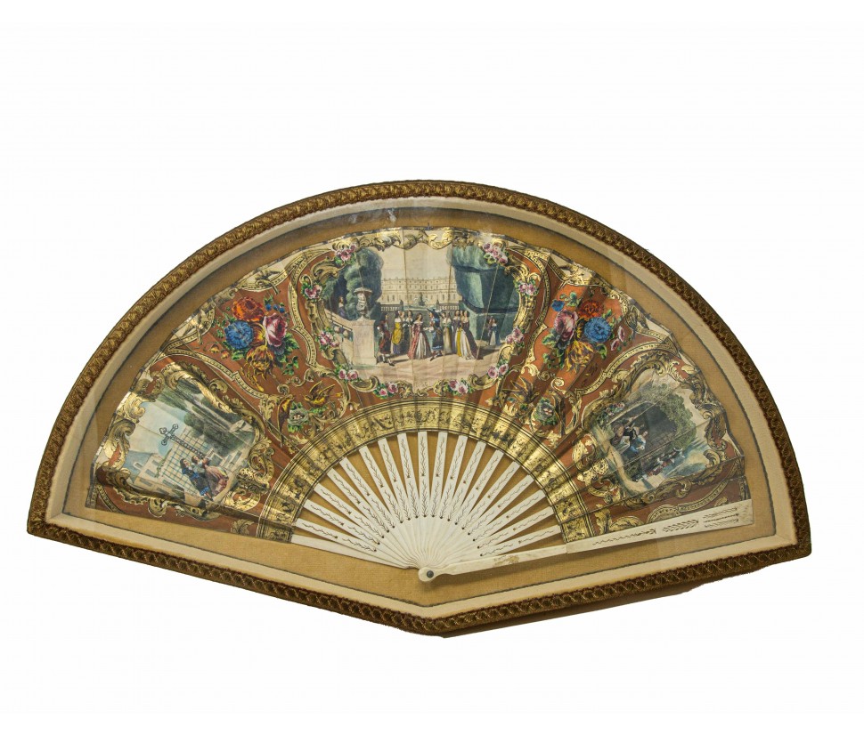 The fan was a very popular tool at the time, because of its characteristic of being portable and handy, as well as a real collector’s item. It consists of two main parts: the pavese, consisting of the canvas (painted, printed or not), which can have in addition an embroidery, a lace (especially in European models), or be made of a simple sheet of printed paper and the rigid and folding base.