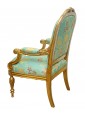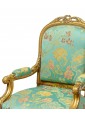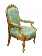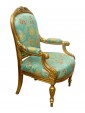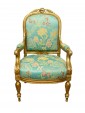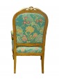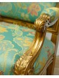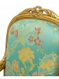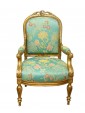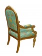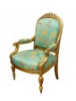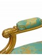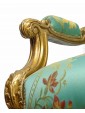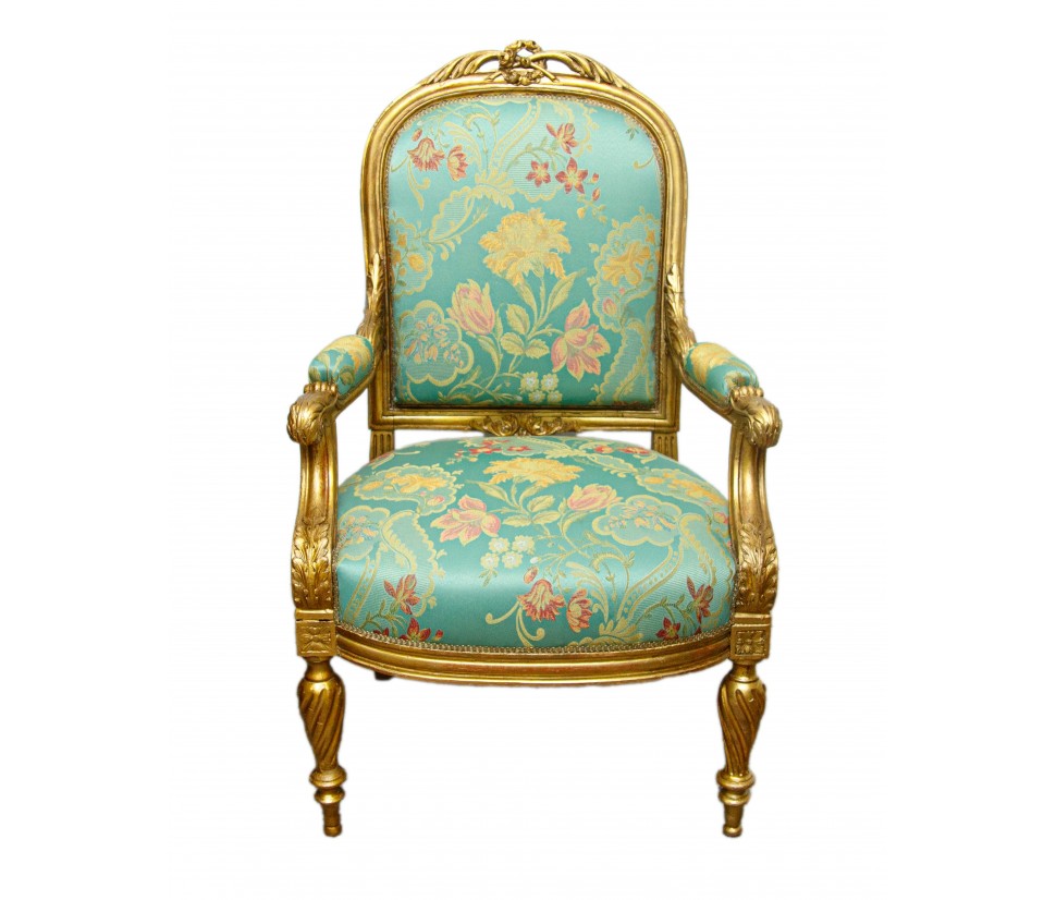 The furniture in question is an armchair of clear Piedmontese manufacture, in gilded wood and turquoise fabric with floral embroidery, referable to the late eighteenth century, a period characterized by the so-called Directory style.