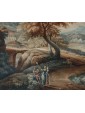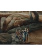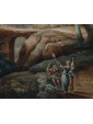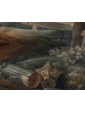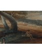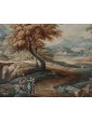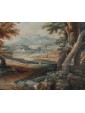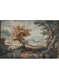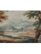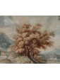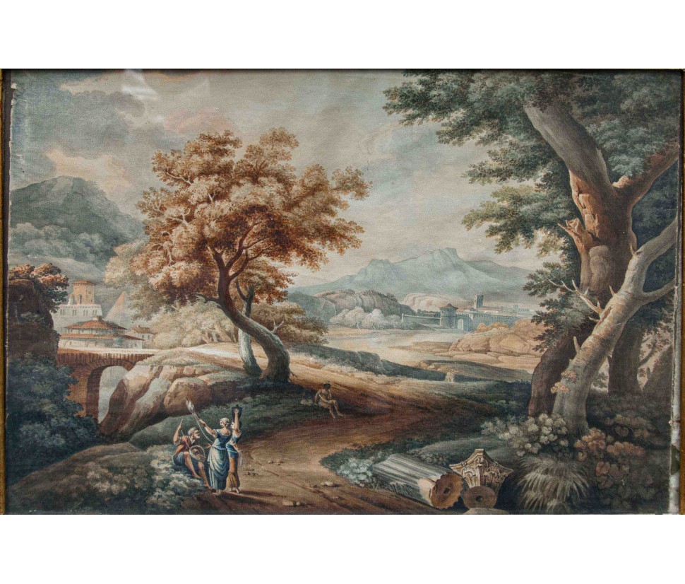 The work, of great refinement made with mixed technique (watercolor, ink, lavis gris) depicts a lush landscape animated by a group of characters, perhaps travelers, caught in a moment of rest.