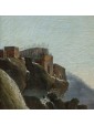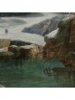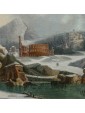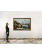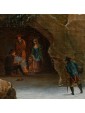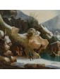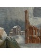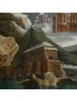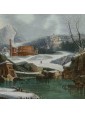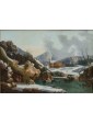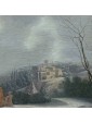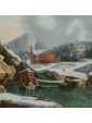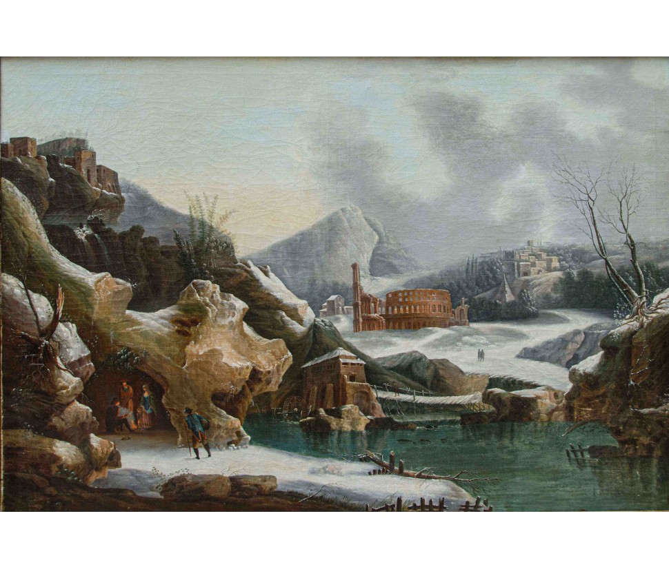 Its snowy scenery dotted with bare trees, small mountain landscapes with sloping roofs of Nordic flavor, frozen lakes and travelers are imbued with an intense lyricism and a melancholy vision of nature that can well be defined pre-romantic. Some of his works are kept in important Italian and European museums: for example, a "Winter landscape with hikers" is located at the Thyssen-Bornemisza Museum, Madrid or the Pinacoteca civica of Ancona. The refined painting examined sees the careful observation and the sophisticated restitution of the atmospheric data, made with different gray-silver variations, balanced by the greens and the brown of the vegetation. On the left bank of the river a figure heads towards a cave where some characters are warming up to the warmth of a fire. On the upper right, perched on a small cliff, there are some houses while in the distance are described high and rocky mountains. The particular uniqueness of this painting is the imaginative addition of two strange monuments: the ruins of an ancient amphitheater (with not too hidden reminiscences of the Colosseum) and behind the trees what seems to be an allusion to the pyramid Cestia.