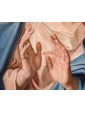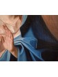 A divine candor reverberates with vibrant shine on the Virgin’s maphorion. The palpable iridescence that structures its thin rosy robe, woven of the same fresh light, produces a slight rustle when you lift your hands. The Madonna in fact acts prayerful, opening her palms to underline the fiery ecstatic intention; the white neck is rendered with a perita fullness of pigments, Like the hands, perfectly alive, and the eyes gleam. With fine care the artist of the present configures the hair of the Virgin through thin white ribbons, which indicate purity. An evocative light falls softly on the half-bust, a materialized sign of divine glory.
