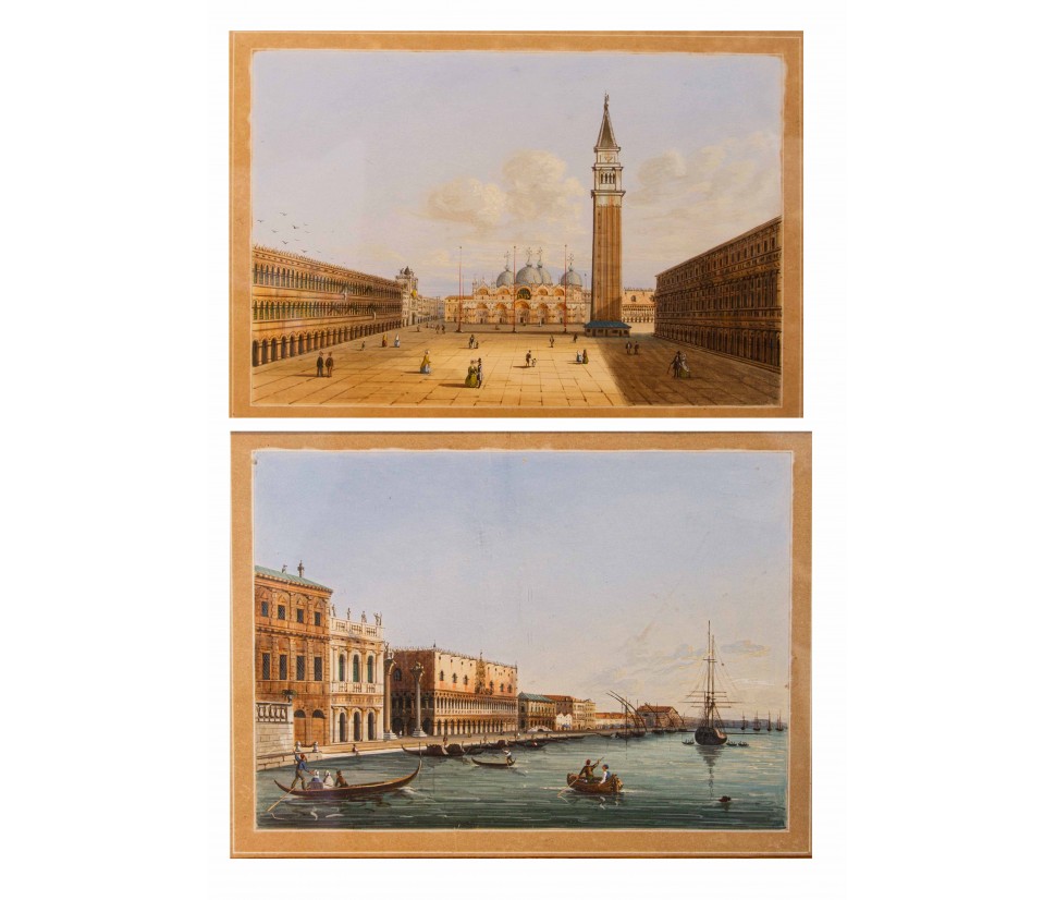 The two views in question, a pair of gouaches on paper depicting respectively St Mark’s Square and the San Marco Basin, are related to the Venetian school of the nineteenth century, with every probability to an artist who looks at the great nineteenth-century Venetian vedutists: Vincenzo Chilone (Venice, 1758 - 1839), formed from the age of twenty in the workshop of Francesco Battaglioli, famous for its topographical accuracy and lively depiction of daily life in Venice; Carlo Grubacs (Venice 1802 - 1878), who attended the School of Fine Arts in Venice under the guidance of Teodoro Matteini, participating in numerous exhibitions. Epigone of the nineteenth century Venetian vedutism, made compositions with soft colors in the skies and backgrounds, always maintaining the use of perspective shots rigidly similar to theatrical scenes; Luigi Querena (Venice, 1824 - 1887), whose paintings, able to capture the beauty of the Italian landscape in a precise and suggestive way, had a high degree of popularity for their high historical value: they documented, in fact, The appearance of Italy before the country was unified.