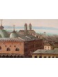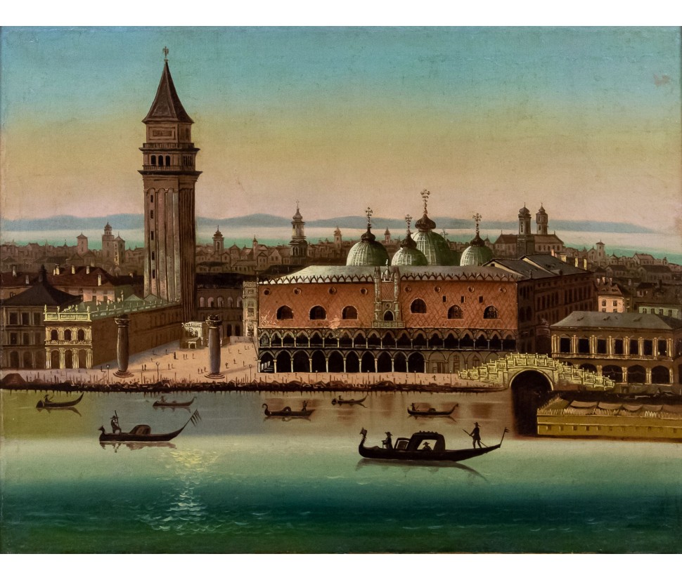 The unusual perspective chosen by the artist for this Venetian view, raised at a bird’s eye level, allows the painting to be distinguished from the navigated tradition of Venetian vedutism. The scenery returned by the painter, which allows you to appreciate the jewels of the lagoon, including basin and mainland with San Giuliano and Porto Marghera, is also justified by the chronological height of the painting, from the beginning of the 19th century.