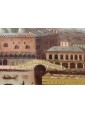 The bird’s eye view suggests a shot from above on the opposite pier in front of the church of S. Giorgio Maggiore. For the present painting, given the moment of composition, and given the extraordinary correctness of each monument, It would be interesting to know whether the artist did not perfectly know the Venetian topography, or if he did not observe the whole with an optical instrument, from a raised floor of the monastic complex of St. George. Beyond the glassy sea with the line of Rio dei Mercanti, the Bridge of Straw on the right, the romanized Bridge of Sighs hidden in the shadow of the channel, and the immediately recognizable Doge’s Palace and Prison Palace is in fact possible to see, beyond the domes of St. Mark, in perfect alignment: the bell tower of the church of Ss. Apostoli in the sestiere of Cannaregio, the building of the Scuola Grande della Misericordia and immediately behind the bell tower of the church of Madonna dell'Orto. Scrolling the horizon to the left, you can also recognize the bell tower of the church of S. Bartolomeo di Rialto, opposite the Ponte di Rialto.