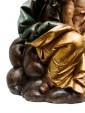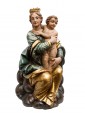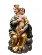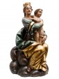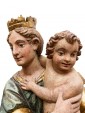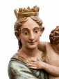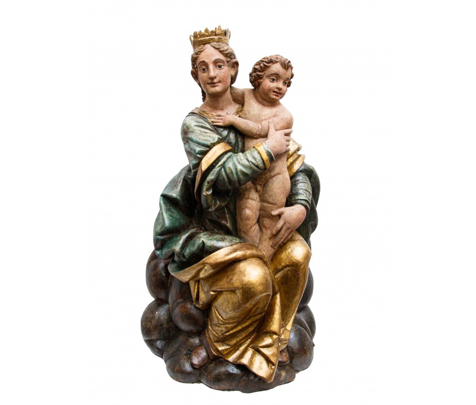 The polychromy of the work is also highlighted by the gold details used in the Virgin’s mantle, which creates vibrant light and chiaroscuro effects. The virgin, with a delicate physiognomy is crowned and seated on a base that simulates a cloud, referring to the divine. Both mother and son break the stasis of the pose by twisting the bodies and heads facing in opposite directions, enriching the composition with a delicate movement and a vitality adherent to the truth.