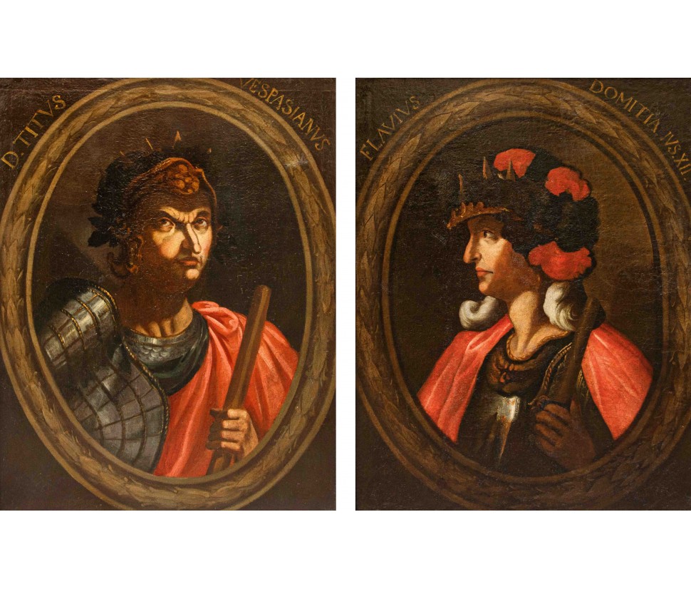 The present pair of paintings depicts two emperors, Domitian and Vespasian, isolated in a trompe l'oeil oval frame. The noble and haughty frown of the figurants, expressively brightened in a bath of shadows, is skillfully dosed by the artist through the use of essential colors: From the bright red of the purple mantles of command to the shadow of the armor, promptly sparkling in a self-referential celebration of power. The portraits certainly take their cue, but not to conform, to the famous series of Eleven Caesars by Titian. Executed for Federico II Gonzaga, the fifth Marquis of Mantua, the series found its natural destination in a room designed by Giulio Romano himself within the Ducal Palace of Mantua. Titian drew inspiration from the lives of the twelve Caesars of Suetonius, centered on the governmental parable that went from Julius Caesar to Domitian, However, he preferred to start his own sequence with Octavian Augustus, the second Svetonian caesar. The paintings were extremely celebrated and were replicated on several occasions by Bernardino Campi, Giovanni Paolo Lomazzo and Annibale Carracci. The Campi replaced Titian (1537-38) in the execution of the last Caesar, Domitian (1562). Sold by Vincenzo II Gonzaga to Charles I of England, the paintings then passed into the collections of the royal family of Spain, being definitively lost in the fire of the Alcazar of Madrid.