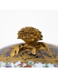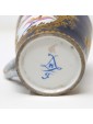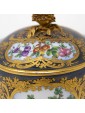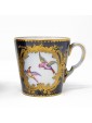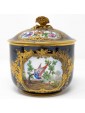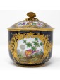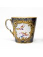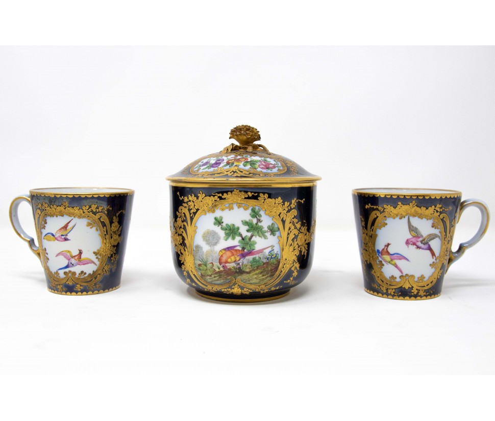 Blue background porcelain decorated in relief gilding and polychrome reserves with floral triumphs and birds in landscapes