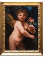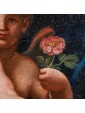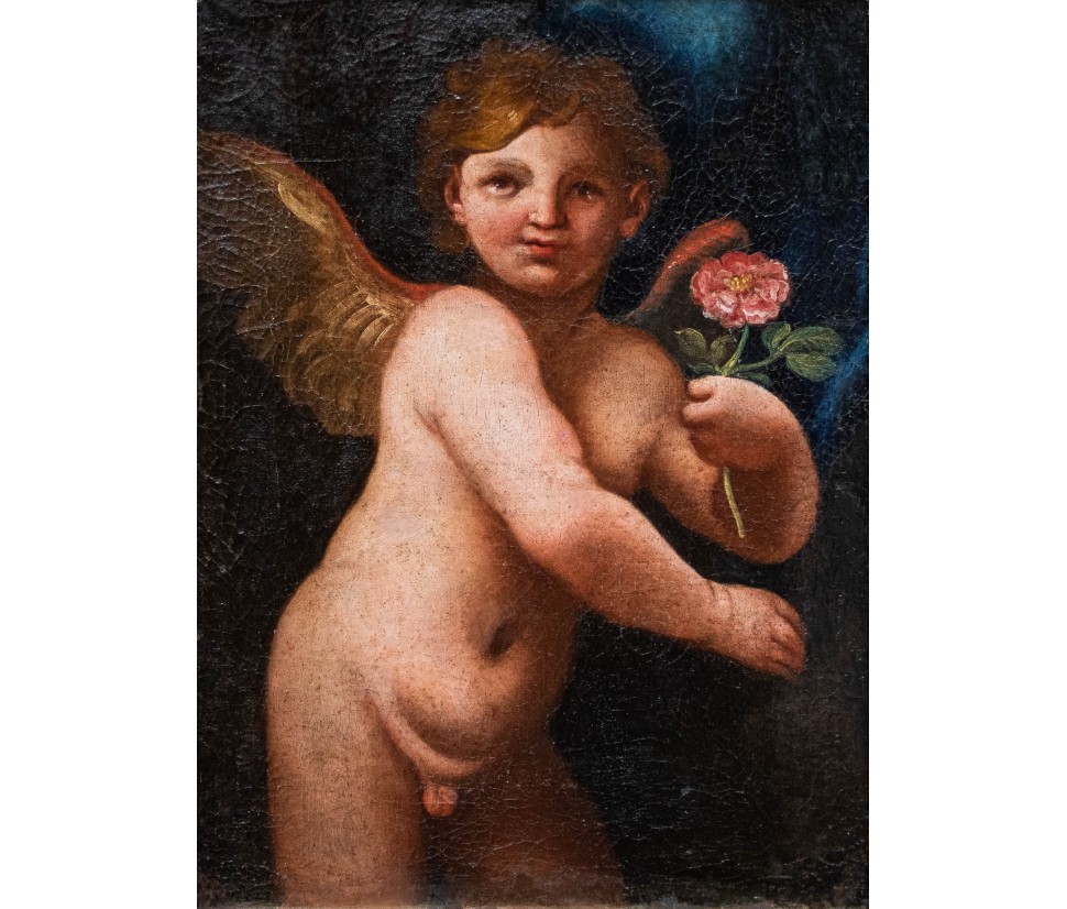 The figure of the putto, when equipped with specific attributes, lends itself to multiple iconological meanings. The present squeezes a delicate flower and at the same time looks cheerfully at the viewer, spreading soft wings. A soft light illuminates the semblance, defining the volumes of the composition. This implies a fleeting allegory of love, to which the little bitch is the preferred representative, and the crystalline flower, reminiscent of both a rose and a peony, It emphasizes both the temporality of the feeling and the joy that it brings. The open wings of the little putto, as well as stretching through a slight dynamism figure, emphasize the immanence of love feeling, totalizing at one time. The uncontaminated nature of the rose also interested the Christian world in the figurative arts, identifying itself with the figure of the Virgin, called "Rosa senza spine". In the pagan world the flower was related particularly to the goddess Venus, but the subsequent medieval reflection on it gave rise to multiple symbolic nuances, linked, as mentioned before, to time, love, truth and innocence.