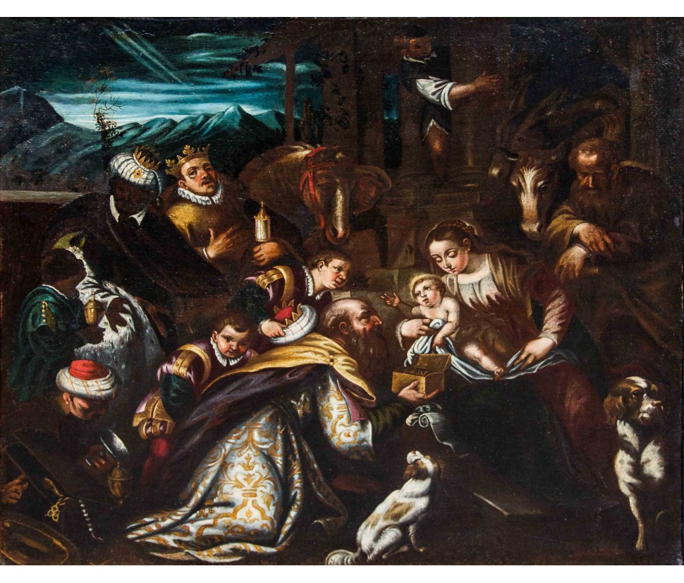 The present Adoration of the Magi shows in fact quotes from the Venetian masters not only in the animal presence but also and especially in the construction of the Virgin with child, slightly elevated position compared to the Magi, and the kneeling of one of the Kings, Probably Melchior seen the seniority and the box of gold that he gives to Jesus. These, in fact, are quoted from the Adoration of the Magi by Francesco Maffei (Vicenza, circa 1605 - Padova, 1660), at the Cathedral of Vicenza which in turn reproduces The Adoration of the Magi by Paolo Veronese (1528-1588) at the National Gallery in London.