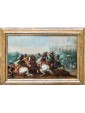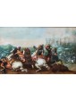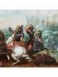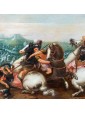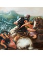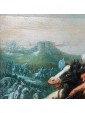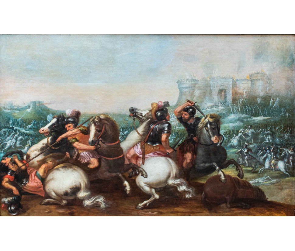 The ancient table is attributed to a 17th century Flemish artist, as can be seen from the use of bright and enamelled colours, the attention to detail, the skill with which lighting effects are treated. In the foreground two monomachies, which refer to ancient examples, in which two pairs of soldiers face each other on proud horses. One of these, now fallen, abandons his bowels to the weight of death while the contender uses every muscle fiber of his body to strike with the lance the fatal blow. Next to each other two knights are fighting with sword. The background in the distance, characterized by a cold and cerulean color opens to a horizon that promises the dawn of a new day, while on the battlefield figures of knights and soldiers, made with fast and wise strokes, fight for victory. Enveloped by the mist of dawn a great defensive bastion is wrapped by the infernal flames set by soldiers who have now crossed the bridge.