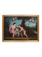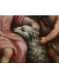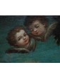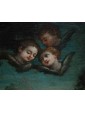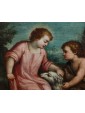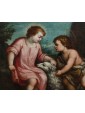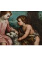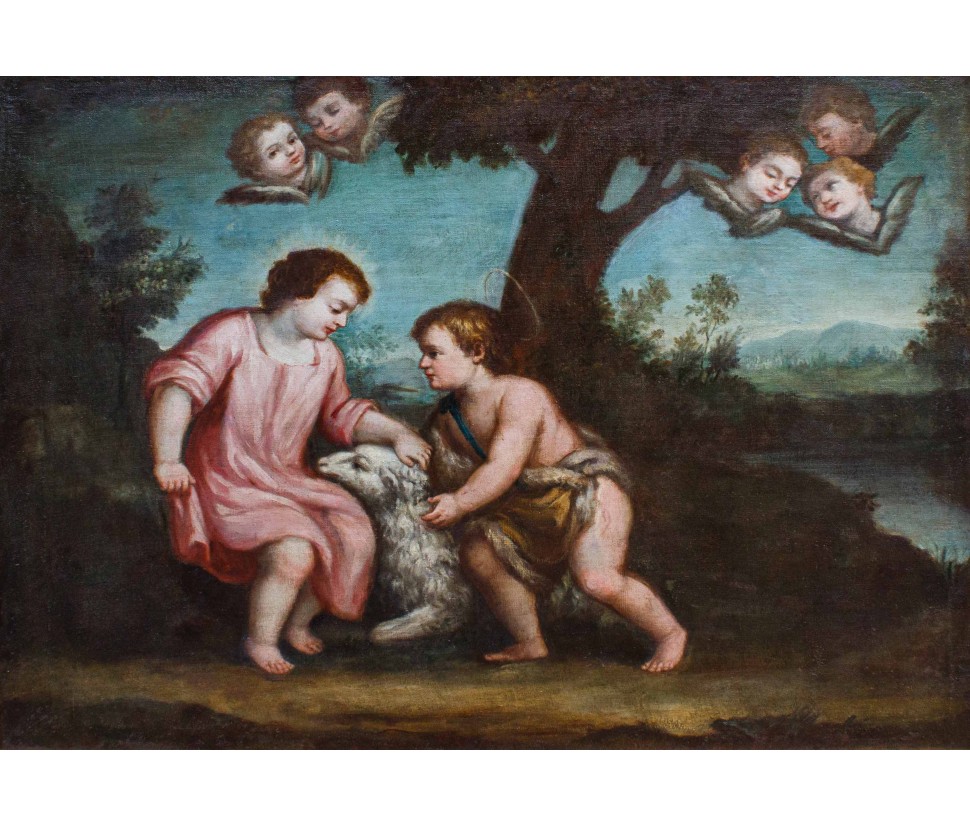 The encounter between the Child Jesus and Saint Giovannino, who first acknowledges in him the messiah, is often pictorially narrated by the depiction of the two infant characters as a premonition specification and manifestation of the divine plan, Always established since the childhood of Christ. In the present painting, The Son sits caressing tenderly the Baptist’s lamb, an allegory of the future sacrifice and of Jesus' role as a shepherd of men. The tunic he wears, in coral tones, also suggests a passionate explanation, being at the same time an appreciated Spanish figurativism. The small winged whoremonies, bringing together at once only the ancient cherubim iconographies and the Renaissance synthesis of sweet little angels, observe from above the scene, witnessing the divine event.
