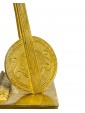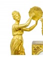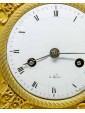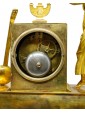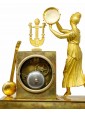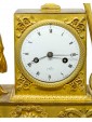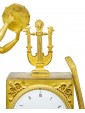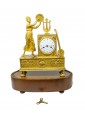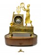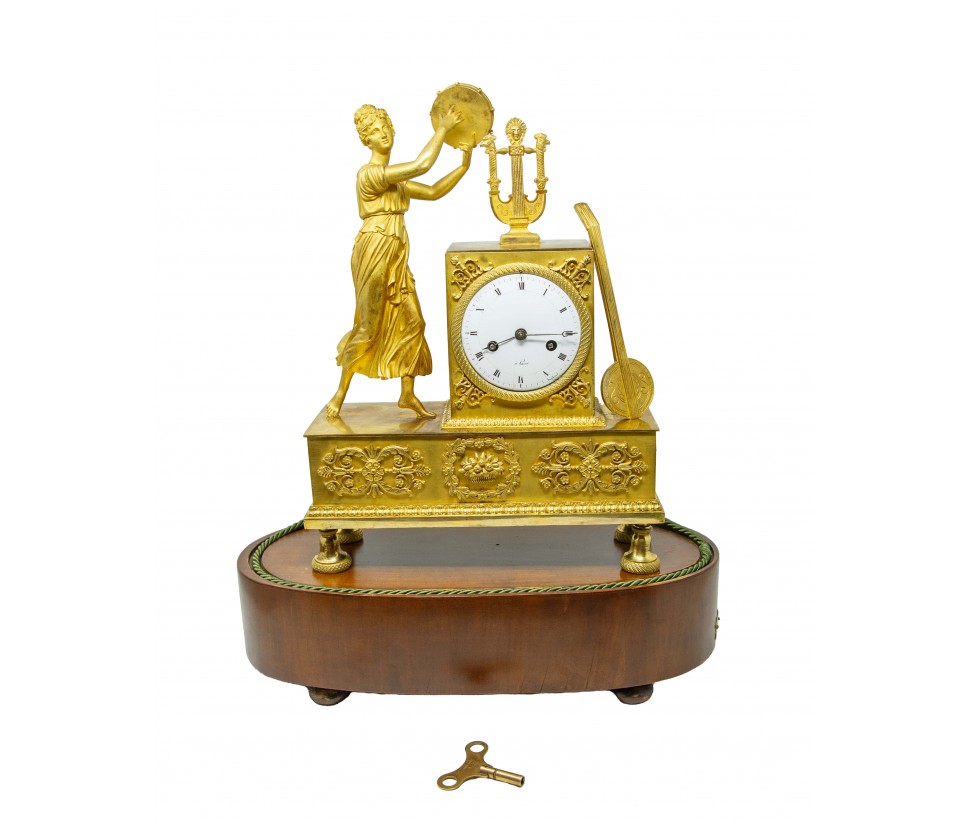 Elegant watch with music allegory in direct dialogue with the car case. A young woman, represented on the type of the dancing nymph or muse, raises a tambourine to the rhythm of music while the peplo that covers it is still caressed by the air tested by the movement. The percussion musical instrument, undoubtedly semantic parallel to the passage of time offered by the clock in its deaf repetition of the leather beat, is accompanied by two other instruments resting on the case. A lyre with a tinted resonance and decorated with swirls, crowning the two outer arms is a pair of rooster heads, in ancient Greece the symbol of music. Even the small head surrounded by digital rays, placed as a solar protome of the device, denounces the refined iconographic context from which the bronzer drew inspiration. The organological parenthesis is completed by a third instrument in which it is possible to recognize a thin bouzouki, a musical specimen of totally Greek imprint belonging to the cordophonic family. Called in the Byzantine era pandoura or tamboura, this object found a happy notoriety both in literary and material field, pride of the most capable musicians and experts in virtuosistically and quickly pinching the strings. The harmonic board of the instrument, circular rather than teardrop, suggests the ancient date on which the artist chose to represent the scene.