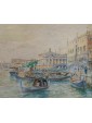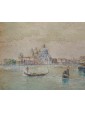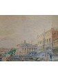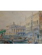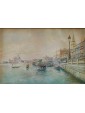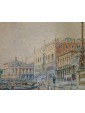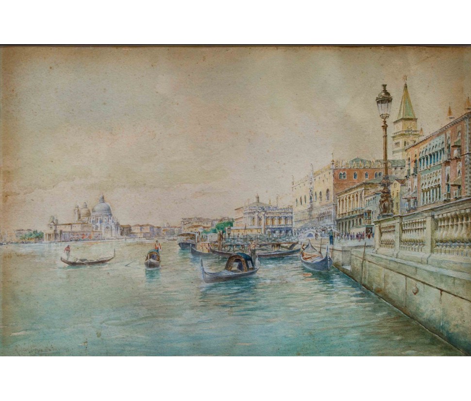 The work, a view of the Doge’s Palace in Venice, is by Rafael Senet y Pérez, painter and watercolourist active between Spain and Italy at the end of the twentieth century. Born in Seville, he attended the Real Academia de Bellas Artes de Santa Isabel de Hungría at the main Andalusian school, attending courses taught by esteemed professors Joaquín Domínguez Bécquer and Eduardo Cano. After a short stay in Madrid, Senet moved to Rome where, under the guidance of José Villegas Cordero, he completed his studies and training: during his years in Italy, the Andalusian artist made several trips, especially to Venice, The city for which he has a great fascination. The iconographic theme of the views of Venice is frequently used throughout the entire corpus of the Spanish artist. In this watercolor, the artist meticulously portrays the gothic facade of the Doge’s Palace and a stretch of the monumental shore of the Schiavoni. Senet, in the vast series of views of Venice, often makes use of the watercolor technique, as can be seen also with regard to the view of the church of Saints John and Paul and the view of the Rialto bridge. Generally, the medium of watercolor is particularly popular in regard to nineteenth-century views of Venice: probably based on the famous series by William Turner, from the forties of the XIX century, there are many artists, both Italian and foreign, who make use of this particular technique for the representation of lagoon landscapes.