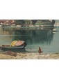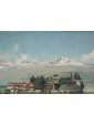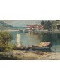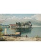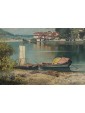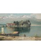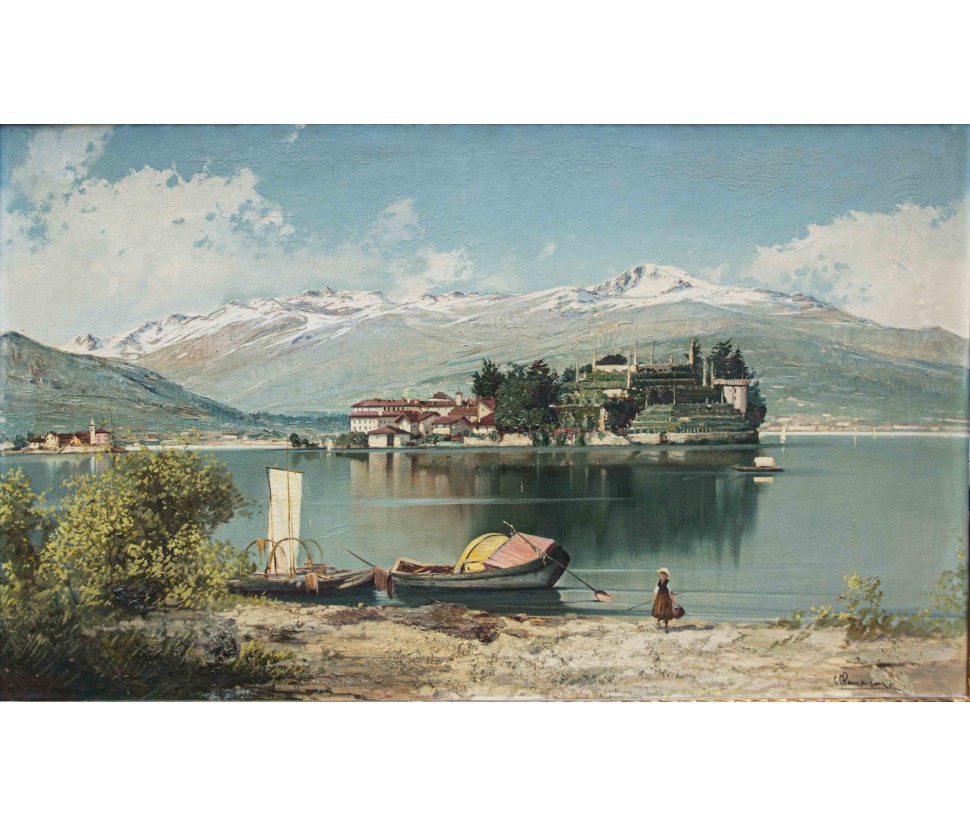 The painting in question shows a splendid view of the Isola Bella, one of the so-called Borromean Islands, which is reflected on the waters of Lake Maggiore. In the foreground is the beach where two small boats are moored and the scene is animated by a girl, only human presence throughout the painting. High snow-capped mountains embrace the island and lake. The oil on canvas is, as can be seen from the signature below right, by the painter Clark Van Clemenson, born in Johnstown, Pennsylvania in 1910. Unknown is the date of death.