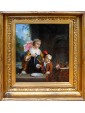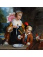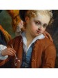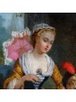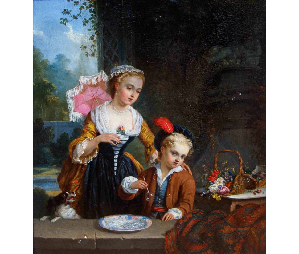 In this painting of a French school, with a leathery and playful tone, but mother approaches her son lovingly to blow a soap bubble. Numerous details of the painting refer to the panorama of French academic painting at the turn of the eighteenth and nineteenth centuries. The rich and opulent robes of the woman, as well as the pretty pink lace umbrella, recall the elaborate costumes of the participants in the country parties of Watteau while the still life on the right of the painting is linked to some models by Chardin and Fragonard. The iconography of the painting, which seems to be based on Le Bolle di sapone by LACMA in Los Angeles, also recalls Chardin’s pictorial activity. In Chardin’s painting, a young man blows a bubble out of a glass of soapy water. Its iridescent and translucent surface captured in sunlight.