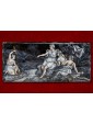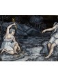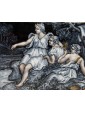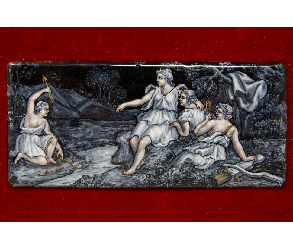 The precious polychrome enamel plaque belongs to the manufacturing production of the city of Limoges and can be placed in the eighteenth century. The long history of craftsmanship and artistic arts in the city can be traced back to the Middle Ages, with beautiful objects made of vitreous enamel using the technique called champlevé, up to the Art Nouveau and then the twentieth century. The success both in medieval and renaissance courts before and against the nineteenth-century high bourgeoisie, passing through the European nobility of the seventeenth and eighteenth centuries, shows the extreme appreciation for the shops of the city, able to innovate their own processing techniques and materials. From enamel to precious metals, from hard stones to porcelain, the masters of the Limoges have constantly maintained a high quality level, finding its way into the export of their works to countries all over Europe and to the most disparate clientele. This plate is part of a centuries-old history, made of craftsmen and workshops passed from father to son for generations without ever losing value in the workmanship and following the taste of each era. In this case the subject represents the goddess Diana, recognizable by the crescent on her forehead and by the hunting weapons scattered throughout the composition, together with the nymphs faithful to her as she rests along the banks of a stream. The bucolic landscape is perfectly matched to the figure of the goddess of hunting, immersed in a forest that opens into a wide clearing interrupted by low hills in the background. The black color of the background suggests a nocturnal setting, also typical of Diana as a deity associated with the moon star; the lighter colors of the most superficial layers of enamel recall the whitish and luminous surface of the moon, Which seems to illuminate the water of the stream, the robes of the goddess and nymphs and the details of the trunks and leaves of the trees. The contrast between dark tones and the light, diaphanous and cold, is so refined and elegant that the enamel can be compared to the precious material of a gem or jewel. To complete the color range there are some gold details, such as arrows, diadems and arches of nymphs and Diana.