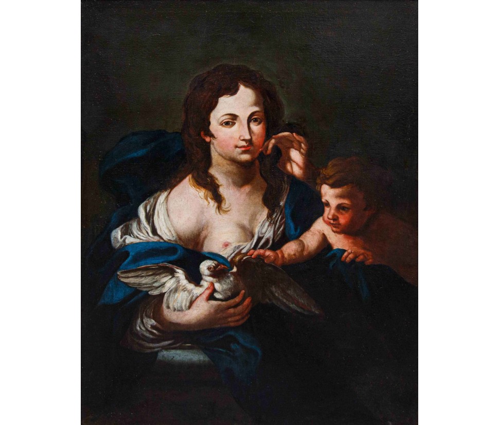 The author of this is an artist belonging to the Emilian pictorial school of the seventeenth century. For compositional and formal evidence it is possible to say that the painter was influenced by Carlo Cignani (Bologna 1628 - Forlì 1719), a famous student of Francesco Albani and one of the most renowned teachers of the Emilian seventeenth century, very close to the present painting with its Venus and cupid kept today at the Galleria Sabauda in Turin. Cignani, who propagated a language faithful to the canons of the Carracci’s Bolognese classicism, acquired and supported increasingly baroque forms, arriving at the appointment as prince of the Accademia di San Luca in 1710. Active in Bologna, then in Parma, he spent the last period of his career in Forlì, expanding the circuit of his students, who in turn were decisive in the codification of the late seventeenth and new eighteenth century taste all Emilia.