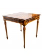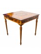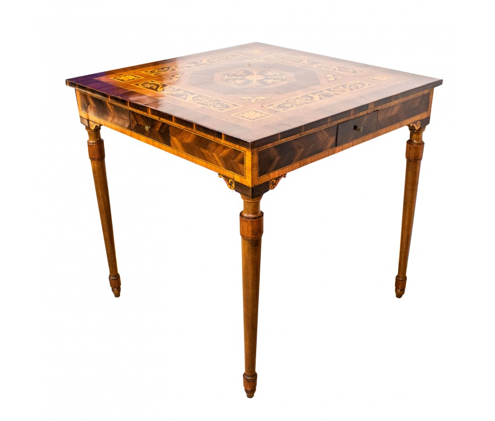 The present, clearly invented in Lombardy, reflects the incisiveness of Maggiolini’s art: in a subtle game of sinuous symmetries, daring ornamental modules are depicted around a central octagon. The internal perimeter plates at the walnut lastronatura are enriched with phytomorphic volutes elaborated in an alternation of lobed flowers and leaves; The presence of newts holding racemes in the largest segment and dolphins with a tail rolled up at the corners of the contour octagon contribute to visually centralize the main composition, consisting of flower and ray racemes. The boxwood thread delimits the vivacity of the colors of cherry and rosewood, accentuating in vibrant alternation the preciousness of the artifact. The elegance of the table is enhanced by the coil legs, with a small nut to which is connected a wavy leaf, evocative visual lightness. It is possible to compare the solutions devised by the present with the drawings of the workshop of Maggiolini, now preserved in the Cabinet of Milanese Designs (but v. also G. Beretti, A. González-Palacios, Giuseppe Maggiolini. Catalogue reasoned of the drawings, Milan 2014).