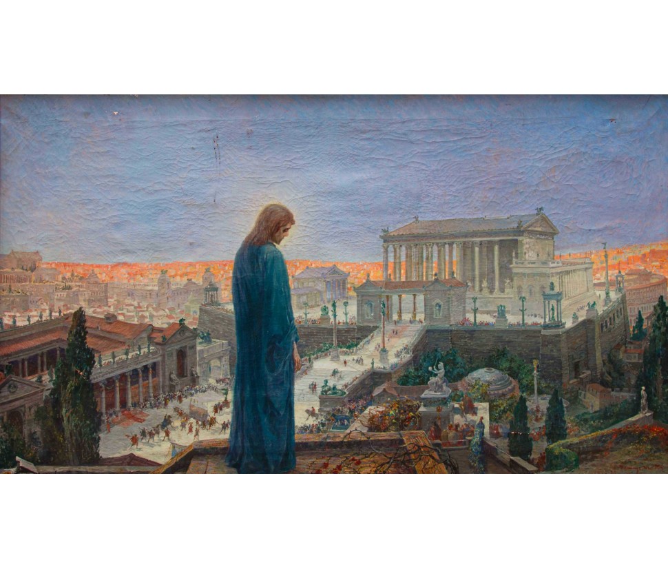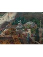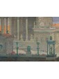 Here Motta reelaborates with some finesse the Roman view by adding the central figure of Christ observing the panorama and a peacock, symbol of immortality and of Christ himself. The complicated reading of the work seems to be a reflection on the future rivalry of Christianity; it was Constantine in 313 with the Edict of Milan to guarantee all citizens, then also to Christians, the freedom to venerate their own divinities. And why not read in the peacock also the symbol of immortality of Rome, eternal city.Domingo Motta was born in Genoa, in 1872, he studied classics at the Liceo Ginnasio Doria, and then enrolled at the Accademia Ligustica di Belle Arti. Later he attended the studio of the landscape painter and portrait painter Vittorio Cavalleri, and also that of the Ligurian painter Cesare Viazzi, at Palazzo Doria del Principe. He completed his studies by enrolling at the Academy of Fine Arts in Rome. His first works are, however, related to the field of scenography for the Teatro Carlo Felice in Genoa, and other companies. His debut as a painter dates back to 1896 when, at the Promoter Society of Fine Arts, he presented the work Black Foam. Around 1899 he began his Parisian experience which proved to be particularly important. Before that he participated assiduously in the regional exhibitions of Liguria and, since 1896, joined the Ligurian Artistic Family, about twenty-five artists including painters, sculptors and architects: Bardinero, G.B. Bassano, Angelo Costa, Calderara, Figari, Pennasilico, Sacheri, Guido Mejneri, Cesare Viazzi and others.