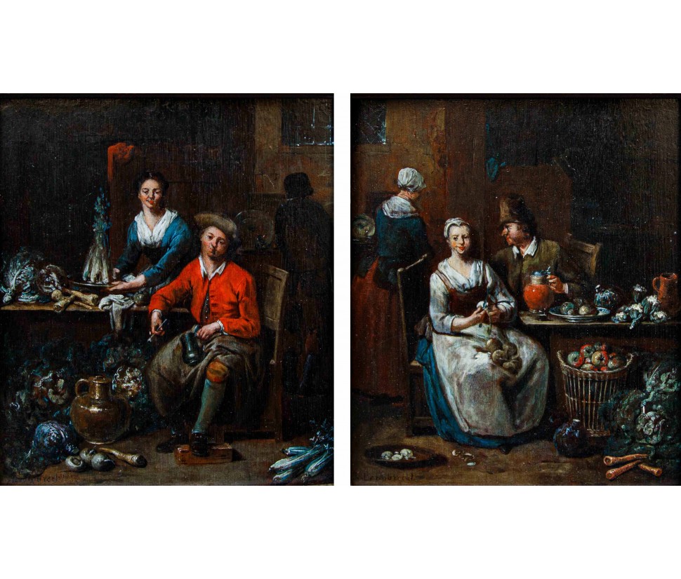 Jan Baptist Lambrechts, a 18th-century Flemish painter, distinguished himself by his meticulous painting technique, fine brushstrokes and ambitious compositional care. His focus was on lively and popular genre scenes, preferring figures such as cooks, maids, vegetable peddlers, farmers engaged in dances and tavern patrons, recurring subjects in his production, as witnessed by the paintings analyzed here.