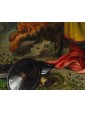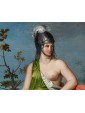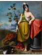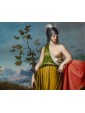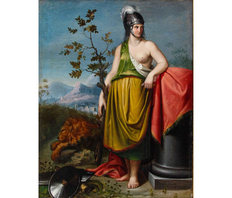 Painted with a strong patriotic meaning, it shows in the centre a female figure, to be identified with the Allegory of Venice: the setting in a rural landscape is different from that of the port and the sea which can be found in the painting of Vicenza but would indicate the Venetian power extended in the hinterland of Veneto and Lombardy during the history of the maritime republic; The presence of a lion must also be interpreted as a clear reference to the main symbol of the lagoon city, represented together with the usual attributes of the weapons, depicted at his feet and next to the laurel wreaths, which refer to military glories. Another patriotic reference is the depiction of the woman with bare breasts, alluding in this way to her function as a mother, while the combination of colors of the dress and the drape resting on the broken column refer to the Tricolor, national flag adopted since 1797 with the Cispadana Republic until becoming one of the most important symbols of the Risorgimento and the Unity of Italy.The warrior holds in her right hand an oak branch, a reference to the military value that the nation is ready to employ for its ransom, while the broken column recalls the fallen for the Fatherland. In the background there is a typical Veneto landscape, which recalls the lagoon tradition in the shaded and clear and smoky skies of the Bellini and Titian, exhibiting a remarkable formal elegance and a refined chromy of sixteenth-century Veneto taste. The definition of this subject, which interprets in a Risorgimento key the allegorical figure of Venice, came from the movements of 1848, in which the city had the brief but intense experience of the Republic of San Marco, formed by Daniele Manin in anti-Austrian function and later approached the annexation to the Kingdom of Sardinia, which took place after the Third War of Independence with the plebiscite of 1866. In these years the Casa elaborates lithographs and engravings, now preserved at the Institute for the History of the Italian Risorgimento in Rome, in order to praise the heroes and patriotic martyrs who fought to obtain independence from the Habsburgs and the annexation to the Savoy kingdom, In this way, he succeeded in reworking the Venetian symbols with a view to patriotism and fusion with the future Kingdom of Italy.