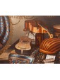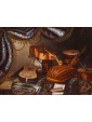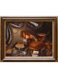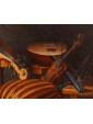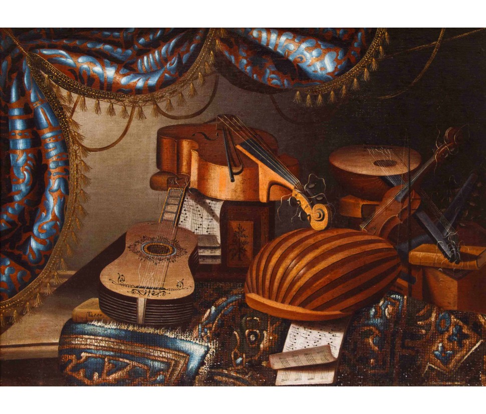 The painting that we can see here is in full configuration in the Bergamasque tradition of musical subject still life, which from Evaristo Baschenis (1617 -1677), true creator of the genre, was transmitted to other painters of Bergamo, including the contemporary Bartolomeo Bettera (1639- post 1688) and the son of the latter Bonaventure (1663- post 1718), to whom this work can be assigned. Going beyond the subject, we can already deduce the distinctive traits that made evolve into a more sumptuous, contrastive and opulent dimension the still lifes created by Bartolomeo first and by Bonaventura later, born and raised in Bergamo; The family had origins that can be found in the centres of the Val Seriana, particularly in Gandino and in the homonymous valley, thus coming into contact with the production of Baschenis. If Bartholomew traveled first to Rome and then to Milan in 1687, where he stayed until his death, probably at the end of the century, little is known about the biography of Bonaventura, although the works attributed to his hand are found mainly in Lombardy and especially Bergamo, thus leaving a zone of activity still linked to the land of origin. Although the tangencies with Baschenis are evident in the subject, in the layout and in the sense of realism, the Bettera will distinguish himself by elaborating compositions characterized by a greater concentration of objects, almost always referring to the musical field, by a magnificence that can be well observed in the preciousness of the embroidery of carpets and curtains, shiny and bright colors, and a more overcrowded arrangement and characterized by more daring perspective views of the elements, Stacked in an opulent and weighted disorder that creates a kind of pile at the center of the composition. These traits, derived from the works of his father, are clearly revealed, as can be seen in the virtuosic perspectives of lutes and violins and the use of precious blue and gold tones of curtains and carpets, bright, vibrant and contrasting with the environment in penumbra by more muted colors; also you can see typical features of his compositions such as partial opening and discomposed of the curtain, the pile of objects, the apparent disorder on the table, revealed by the scrunched scores, the misaligned and overlapping instruments and the submerged books below, among which one is found written on the back Tasso, possibly referring to Torquato Tasso, author of the famous liberated Jerusalem, whose family belonged to the ancient Bergamo nobility and was therefore linked to the same territory where the Bettera operated. If the series of works by Father Bartholomew, often signed, is a more substantial and certain catalogue, those of Bonaventura are extremely rare and difficult to locate; two of his certain works are on display at the State Museum of Fine Arts Pushkin, in Moscow, and reveal in the protruding texture of the canvas in the parts of the carpets, a distinctive trait compared to Bartolomeo, which we also find in our work. Several others have passed on the antique market or are found in private collections and in many of these you find this peculiar detail, which is then added to a more homogeneous and opaque use of light and a particular taste for cold shades, such as blue and blue, Also used in this canvas.