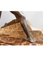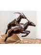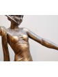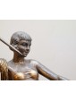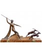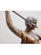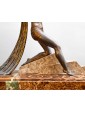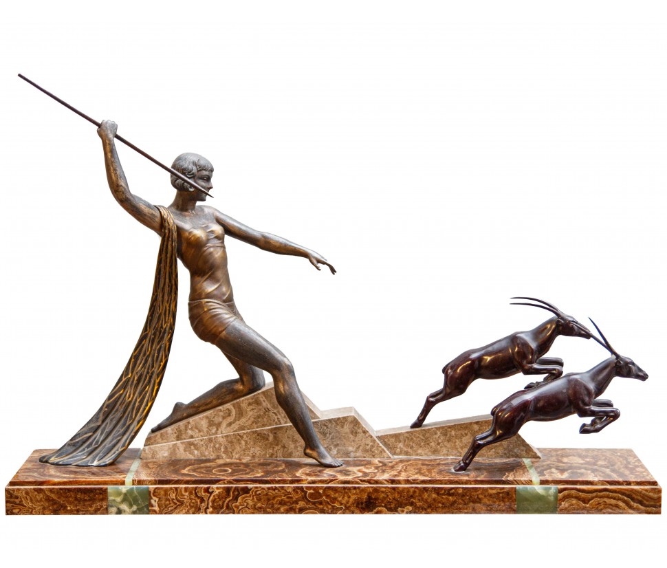 Sculpture in art deco style made in France in the first decades of the twentieth century by the French sculptor J. Dauvergne, as indicated by the legible signature on the onyx base on which is set the figure of Diana. The goddess of the hunt is caught in plastic pose as she is about to throw her spear against two fleeing antelopes placed a few steps ahead of her; both the momentum of Diana’s body and the pair of animals, caught while jumping forward, give remarkable dynamism to the sculptural complex, which in addition to the flat base is completed with an emerging polyhedral surface and different material than the one below. The different colors of the base, the dynamic plasticity and the processing of bronze, patinated and silver, give preciousness and variety to the work, which demonstrates the taste of the period and style in using new and different techniques and materials, Cleverly integrated and united in a single work despite their heterogeneity.