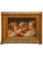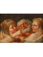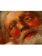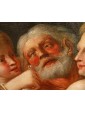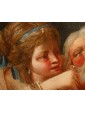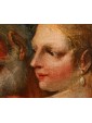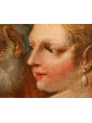 The protagonists are depicted here in half-height, placed in the foreground compared to the neutral black background, in some ways taking up the setting inaugurated by Giorgione in the famous painting The three ages of man, kept at the Palatine Gallery in Florence. From a formal and chromatic point of view, in fact, the canvas under examination can be referred to a Venetian artist active around the middle of the eighteenth century, who had the opportunity to compare with the great models of previous centuries. The wise use of light and color are, in fact, distinctive elements of Venetian painting of this period: masterfully exploiting light to create effects of atmosphere, depth and softness, the artist gives life to a work of great charm and realism. The colors used, bright and vibrant, juxtaposed with quick and pasty strokes in a bold and contradictory way, create a dynamic narrative effect.