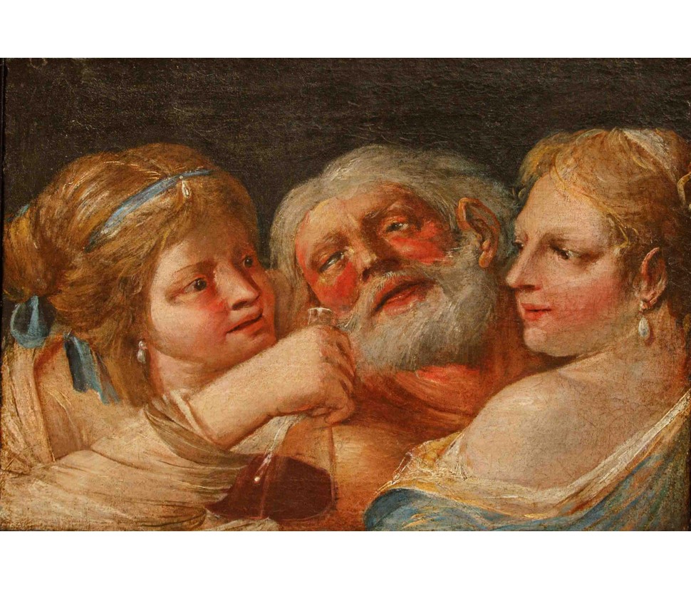 The canvas clearly depicts Lot and his daughters, protagonists of the story narrated in Genesis (19,30 - 38) and closely intertwined with the destruction of the cities of Sodom and Gomorrah. Lot, the grandson of Abraham, lived in Sodom with his family, until God, seeing their corruption and sin rampant, decided to destroy them. Two angels were sent to warn Loth and help him escape, but during the flight his wife disobeyed and turned back to look at the burning city, which was immediately transformed into a salt statue. Loth and his two daughters found refuge in a cave: here, fearing they had no other man to procreate with and perpetuate their seed, the daughters made their father drunk and lay with him carnally while he slept unaware of what was happening, getting pregnant.